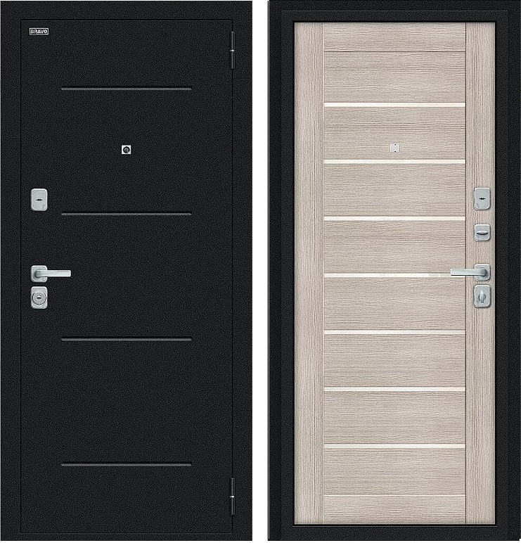 Надежная входная Дверь Браво Техно/BChrome Букле черное/Cappuccino Melinga премиум класса по цене 34 867 руб. Большая толщина стали защитит от проникновения в ваш дом, квартиру или коттедж. Используется очень качественная фурнитура: замки, цилиндры, ручки, защелки. Покрытие и отделка двери изготовлено под внимательным контролем производителя. Дверь имеет долгий срок службы и гарантию.