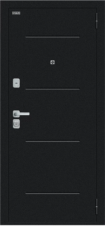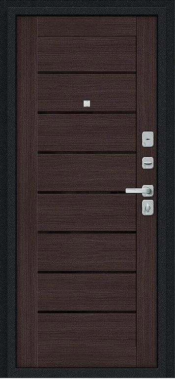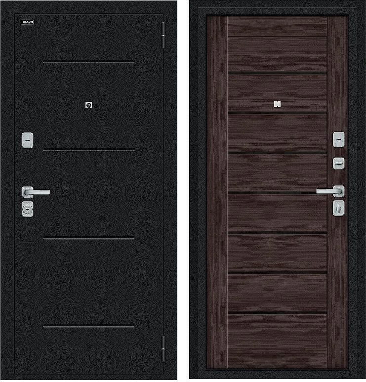 Надежная входная Дверь Браво Техно/BChrome Букле черное/Wenge Melinga премиум класса по цене 34 867 руб. Большая толщина стали защитит от проникновения в ваш дом, квартиру или коттедж. Используется очень качественная фурнитура: замки, цилиндры, ручки, защелки. Покрытие и отделка двери изготовлено под внимательным контролем производителя. Дверь имеет долгий срок службы и гарантию.